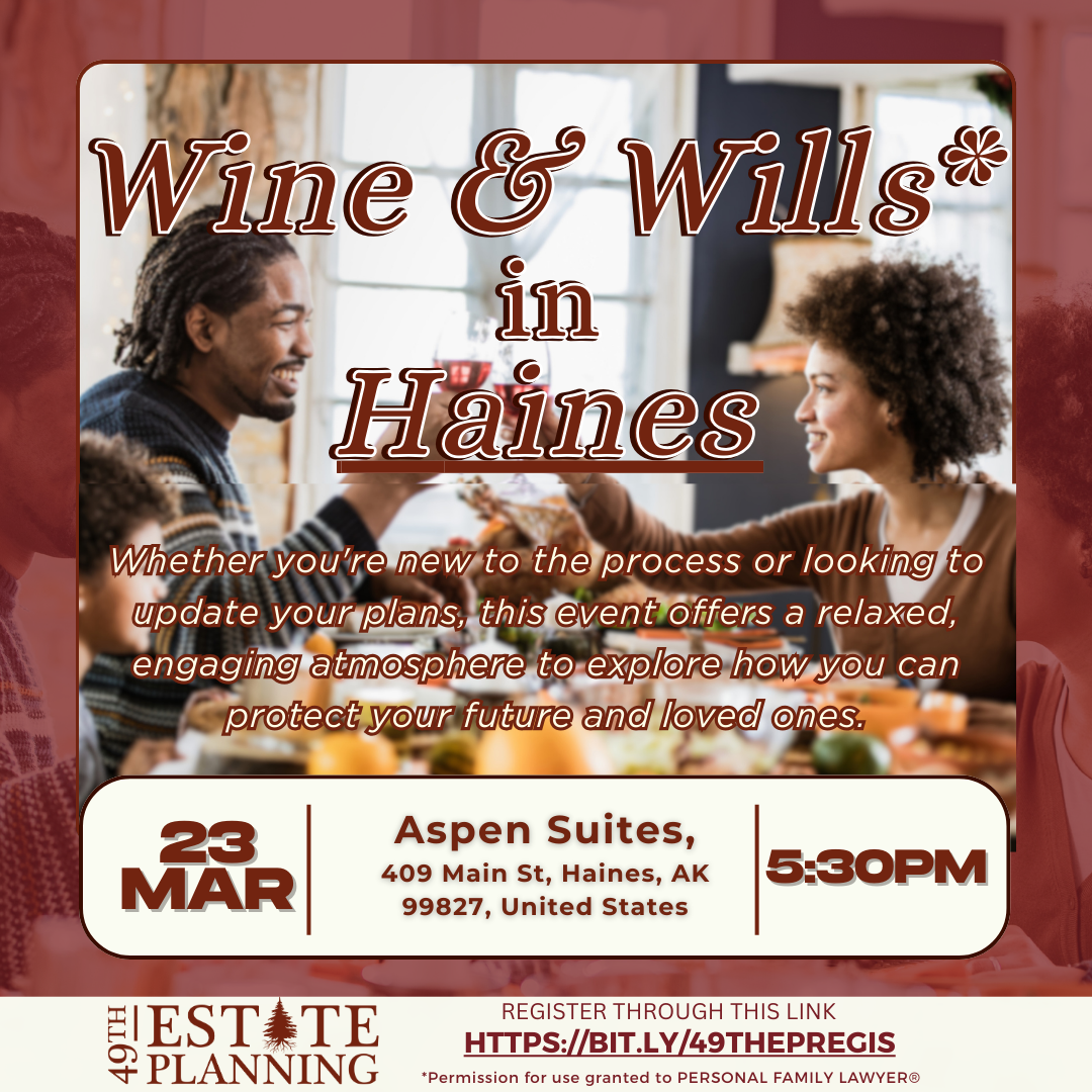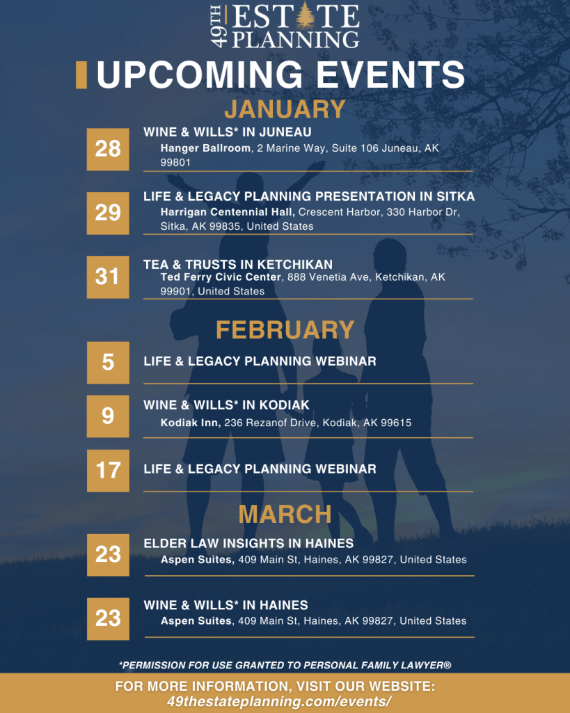 At 49th Estate Planning, we believe that everyone deserves the tools and knowledge to protect their family and build a meaningful legacy. That’s why we’re hitting the road, visiting communities across Alaska to host free educational events about estate planning.